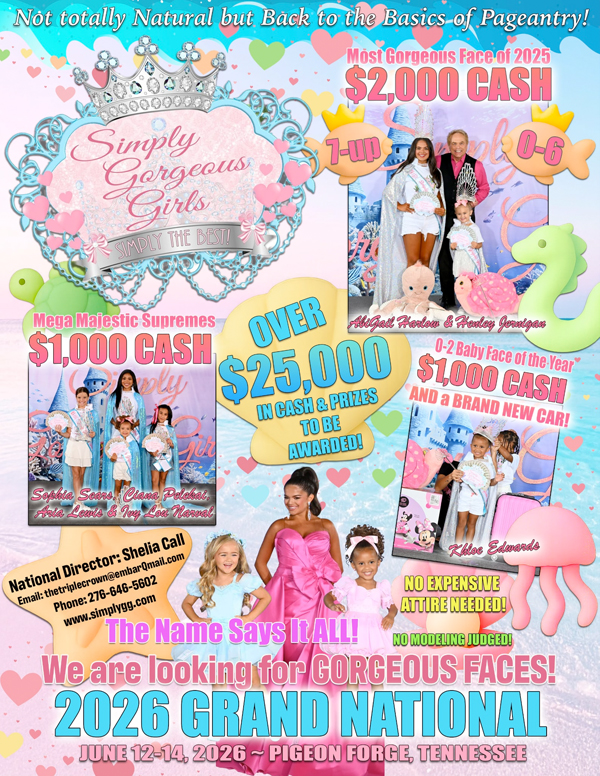 7 & up - Light age appropriate make-up to enhance the Contestants Natural Beauty. Natural, Pretty and Age appropriate Hair Styles. Light to minimal tanning allowed (not overdone). Tea Length, Ball Gown or Party Dress.
